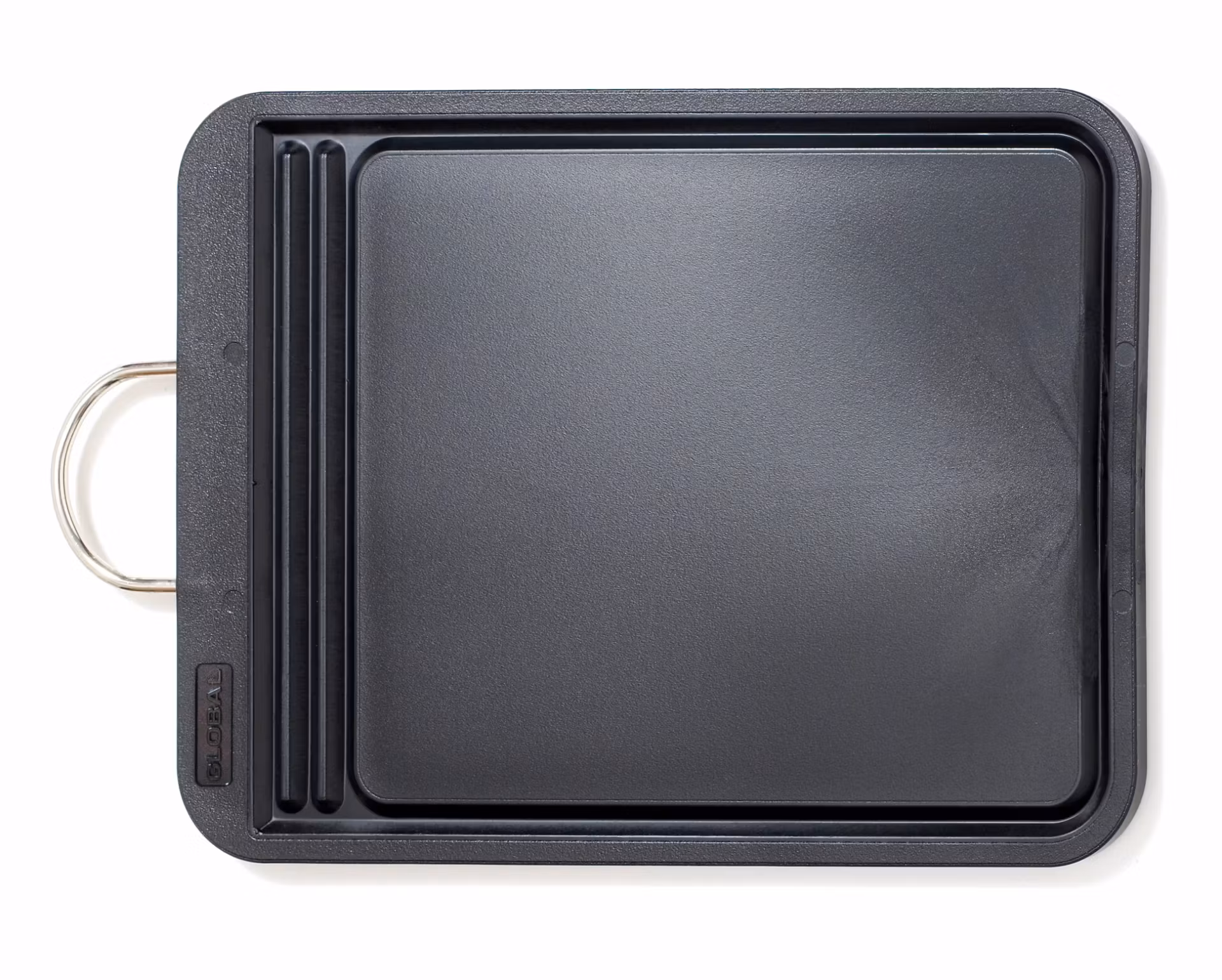 Globals stilrena skärbrädor finns i flera olika modeller. Den här är tillverkad av livsmedelsklassad plast, vilket gör skärbrädan skonsam mot knivens egg och lätt att hålla ren. Skärbrädan drar inte heller åt sig någon lukt. De praktiska handtagen är i rostfritt stål.
