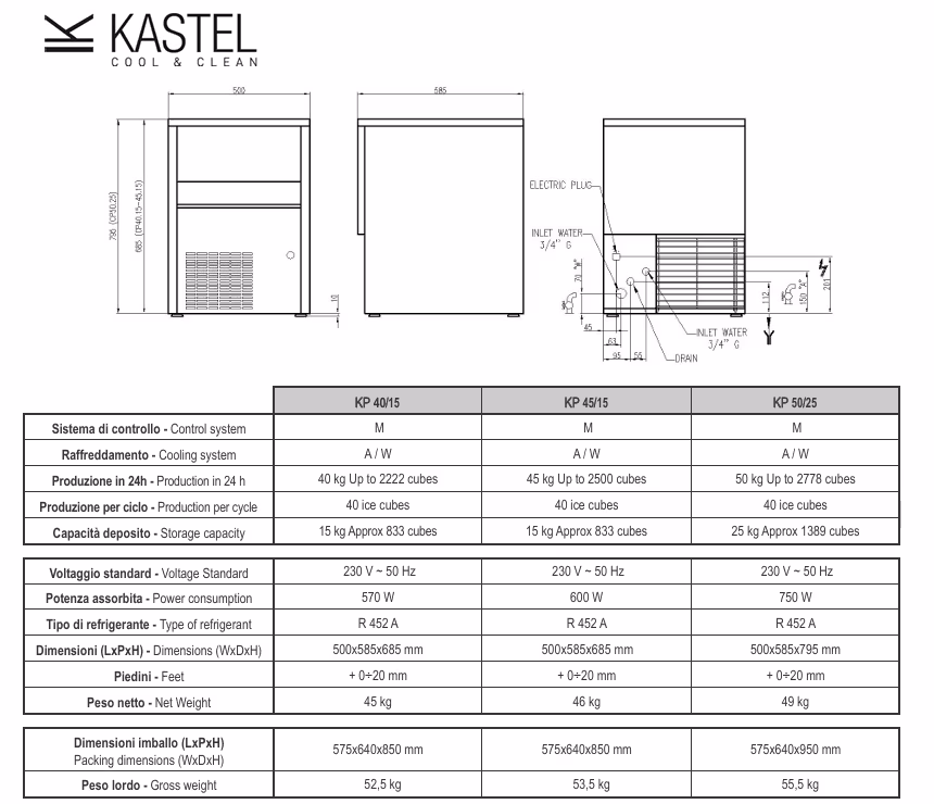 Kastel KP 45-15 A är en luftkyld iskubmaskin för professionell användning, utvecklad för verksamheter med högt isbehov men begränsad yta. Maskinen är avsedd för placering under bänkskiva (900 mm) och levererar pålitlig produktion även vid intensiv drift.