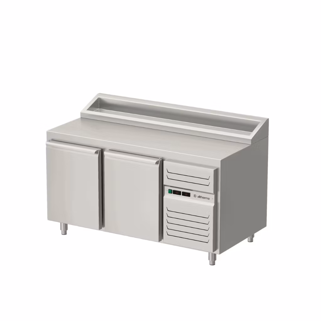 Bänkarna är tillverkade av kvalitetskomponenter för att skapa största möjliga tillförlitlighet och ge en lång livslängd.ROSTFRITT: De levereras klara för användning och har stommar i rostfritt stål både invändigt och utvändigt.Dörrarna är utrustade med magnetlister som enkelt går att byta ut.Digital displaykontroll.Ett hyllplan.Dörrsektionen är utrustad med gejdrar för 450 x 600 mm eller 400x600mm degplåtar.Avkokningslåda med värmeelement för kondensvatten.Kapacitet (kylränna): - 8x GN 1/6 för Pizzakylbänk 160cmLaminatskiva ingårSpecifikationer