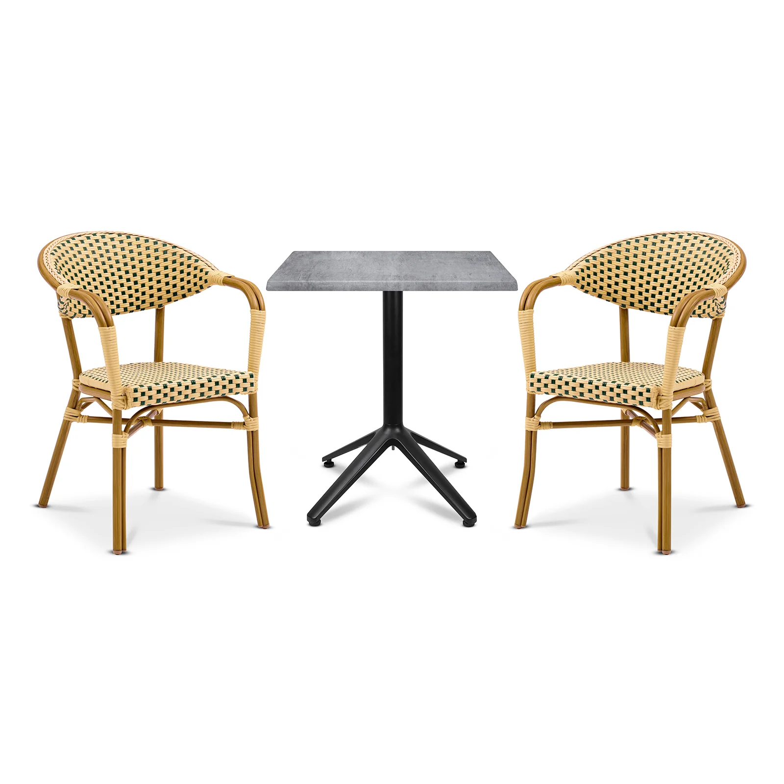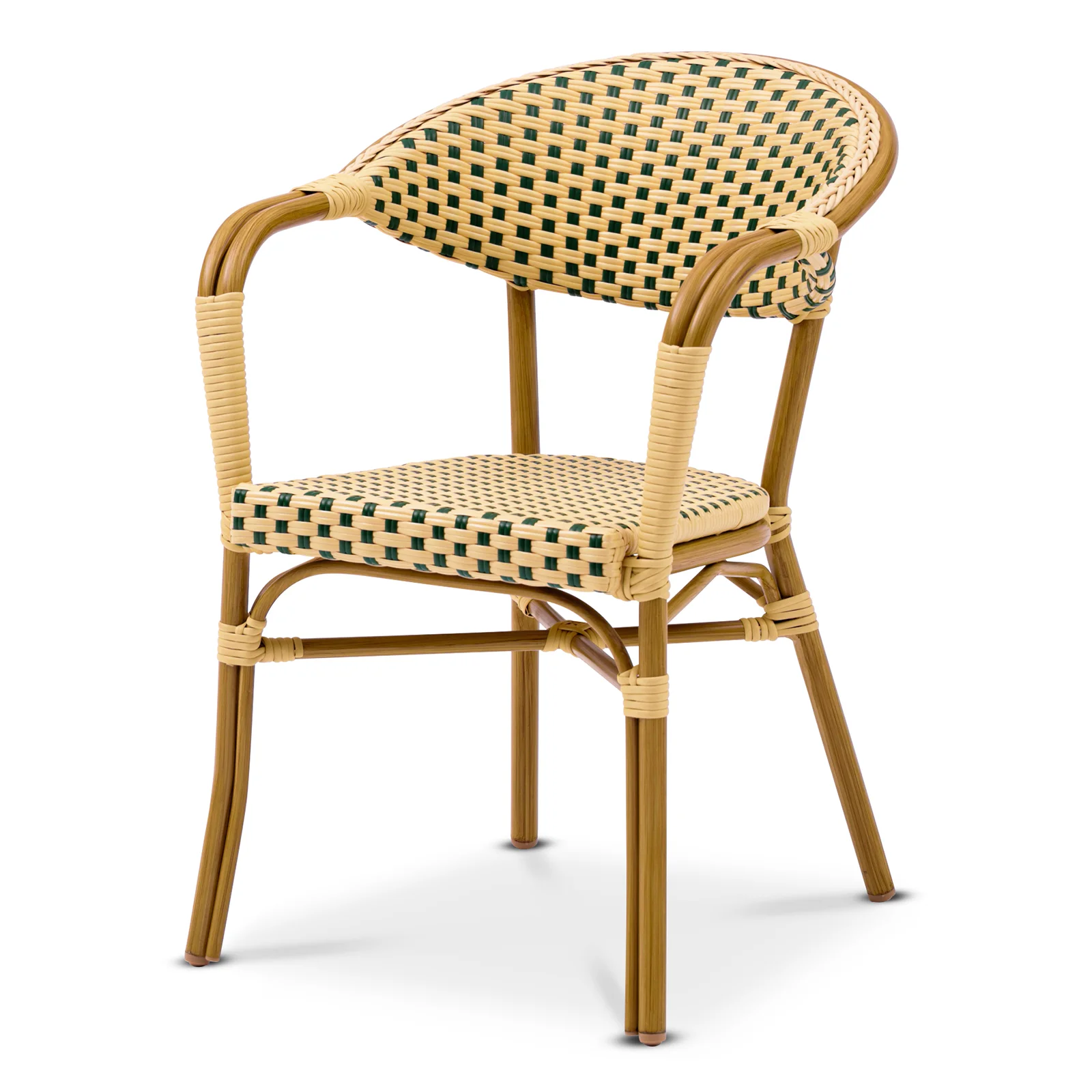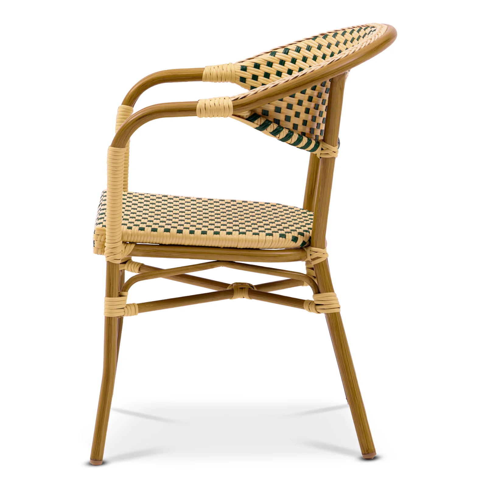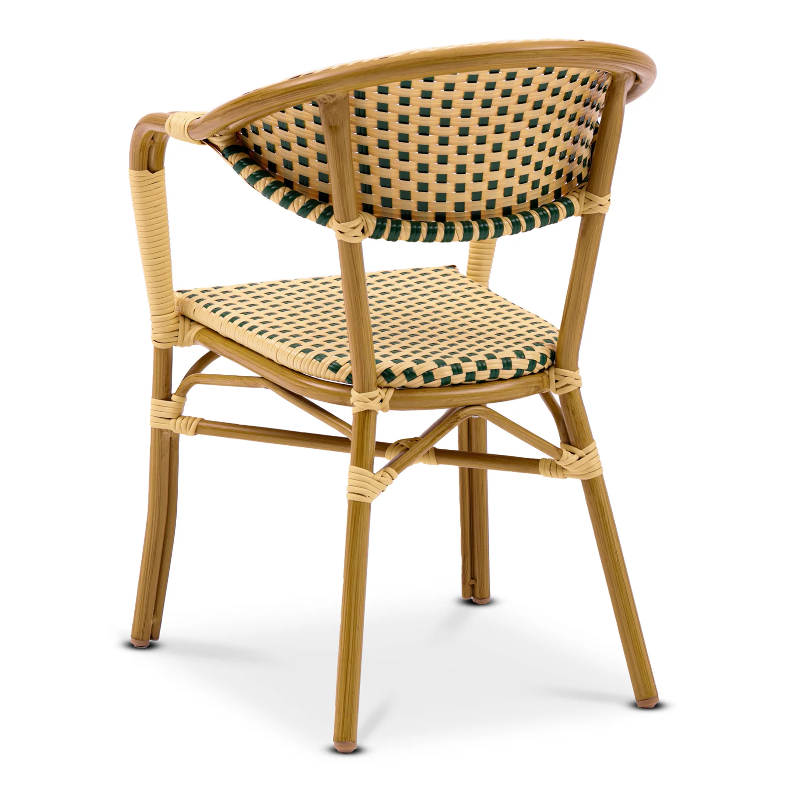 En klassisk karmstol som ger stöd för rygg och armar. Karmstolen är tillverkad av Ø 28 mm aluminiumstomme för en lägre vikt och en enklare hantering. Sits och rygg är gjorda av grön/creme-färgad fiberrotting.