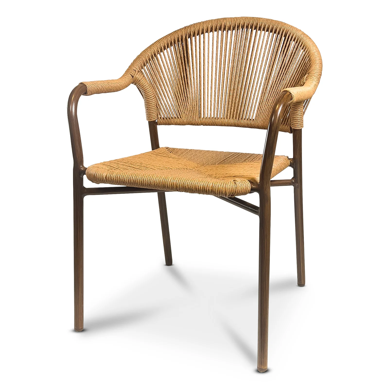 Nätt karmstol med rundat ryggstöd för optimal komfort. Stolen är tillverkad med en Ø 25 mm brunlackerad aluminiumstomme för låg vikt och enkel hantering. Sits och ryggstöd är klädda i slitstark fiberrotting med en textur som påminner om rep för ett naturligt och rustikt intryck.